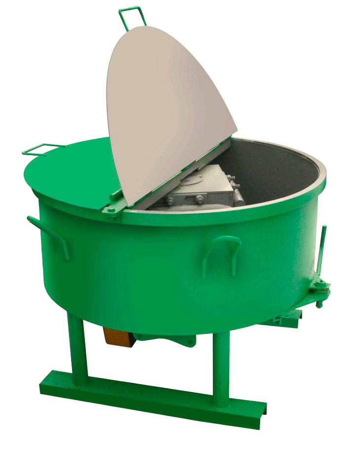 Дозированные составляющие бетонной смеси загружаются в емкость смесителя, внутри которой установлен лопастной роторный активатор. Перемешивание осуществляется лопастями, которые крепятся к стойкам, которые в свою очередь крепятся на корпусе активатора. Конструкция узла крепления лопастей допускает их свободное перемещение в двух направлениях, что обеспечивает возможность регулировки зазора между лопастями, дном и стенками емкости смесителя. Лопасти перемешивают щебень, песок, цемент и воду, образуя однородную смесь. Приготовленная смесь выгружается из емкости смесителя через донный затвор. Донный затвор с ручным приводом обеспечивает выдачу смеси, объем которой регулируется величиной открытия затвора. Благодаря наличию периферийных скребков достигается быстрая и полная очистка стенок емкости смесителя.