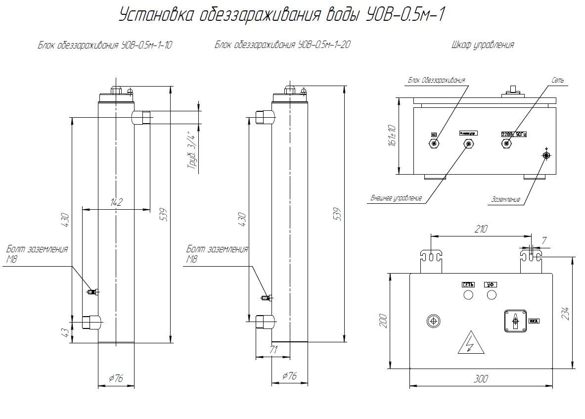 Комплект поставки: Блок обеззараживания с амальгамными УФ лампами; шкаф управления с индикаторами; датчик УФ излучения; датчик температуры; комплект ЗИП; паспорт, руководство по эксплуатации. Промывочное устройство не входит в стандартную комплектацию и заказывается отдельно