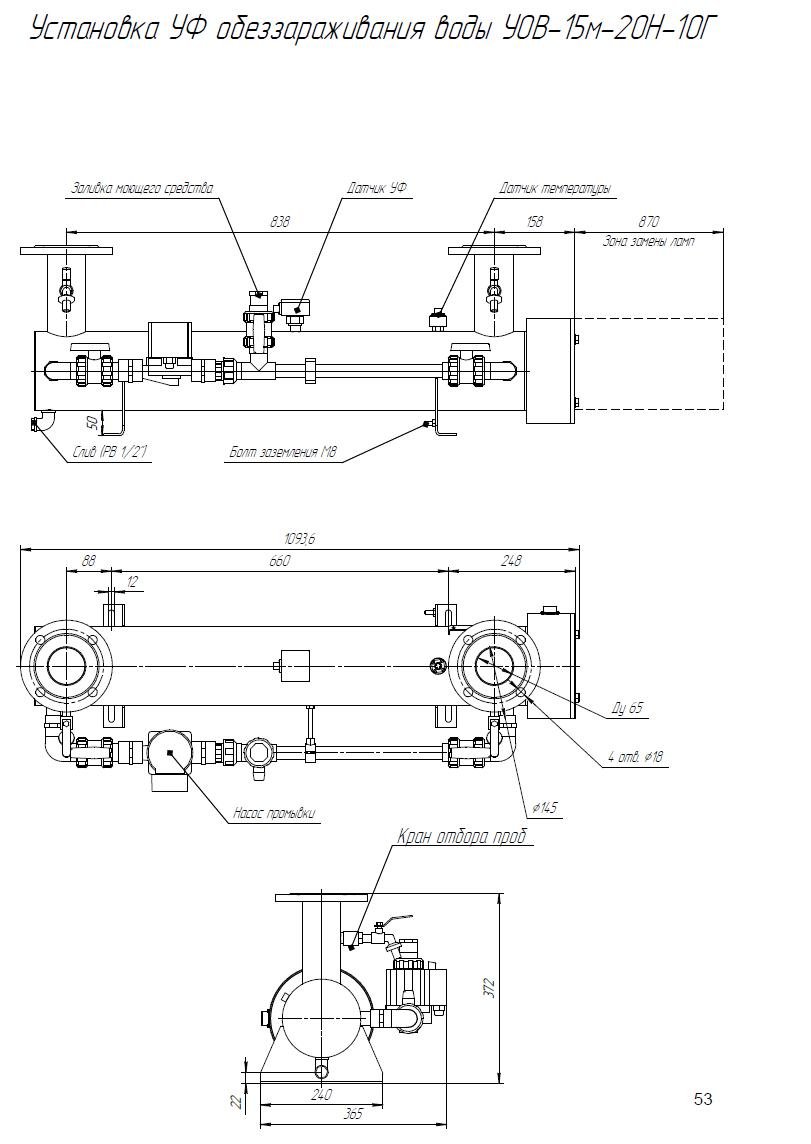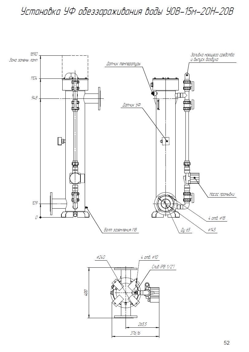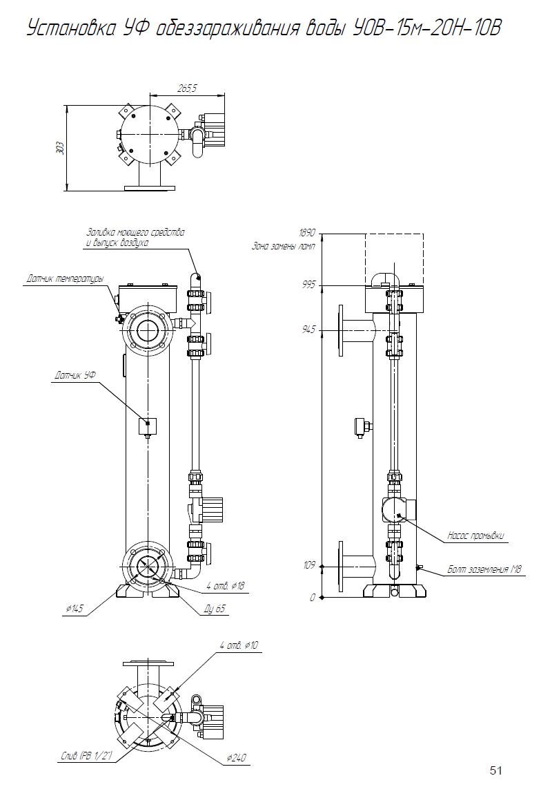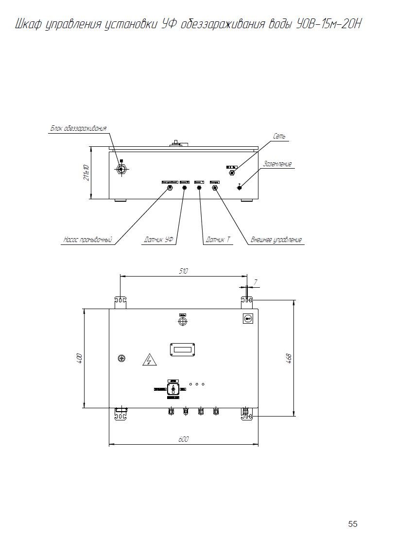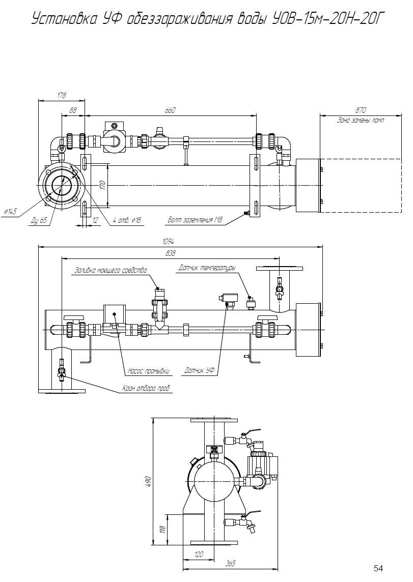 Комплект поставки: Блок обеззараживания с амальгамными УФ лампами; шкаф управления с индикаторами; датчик УФ излучения; датчик температуры; комплект ЗИП; паспорт, руководство по эксплуатации. Промывочное устройство не входит в стандартную комплектацию и заказывается отдельно