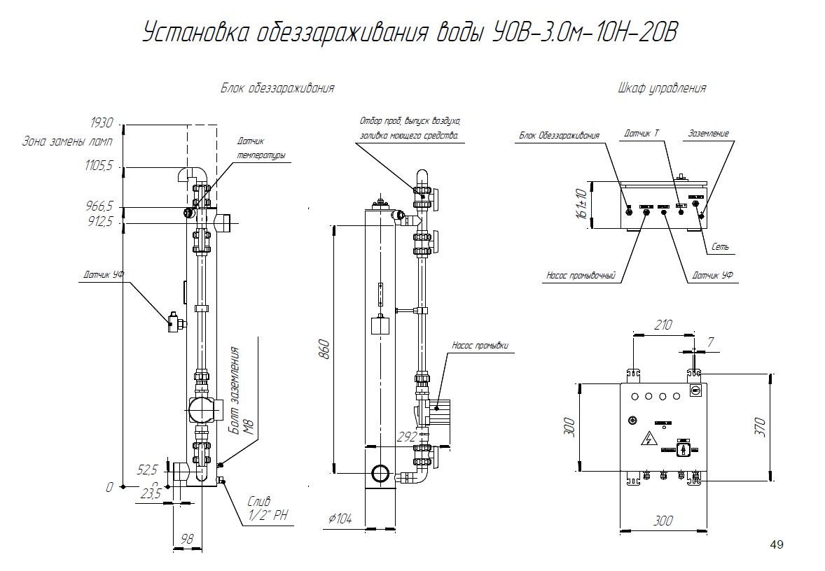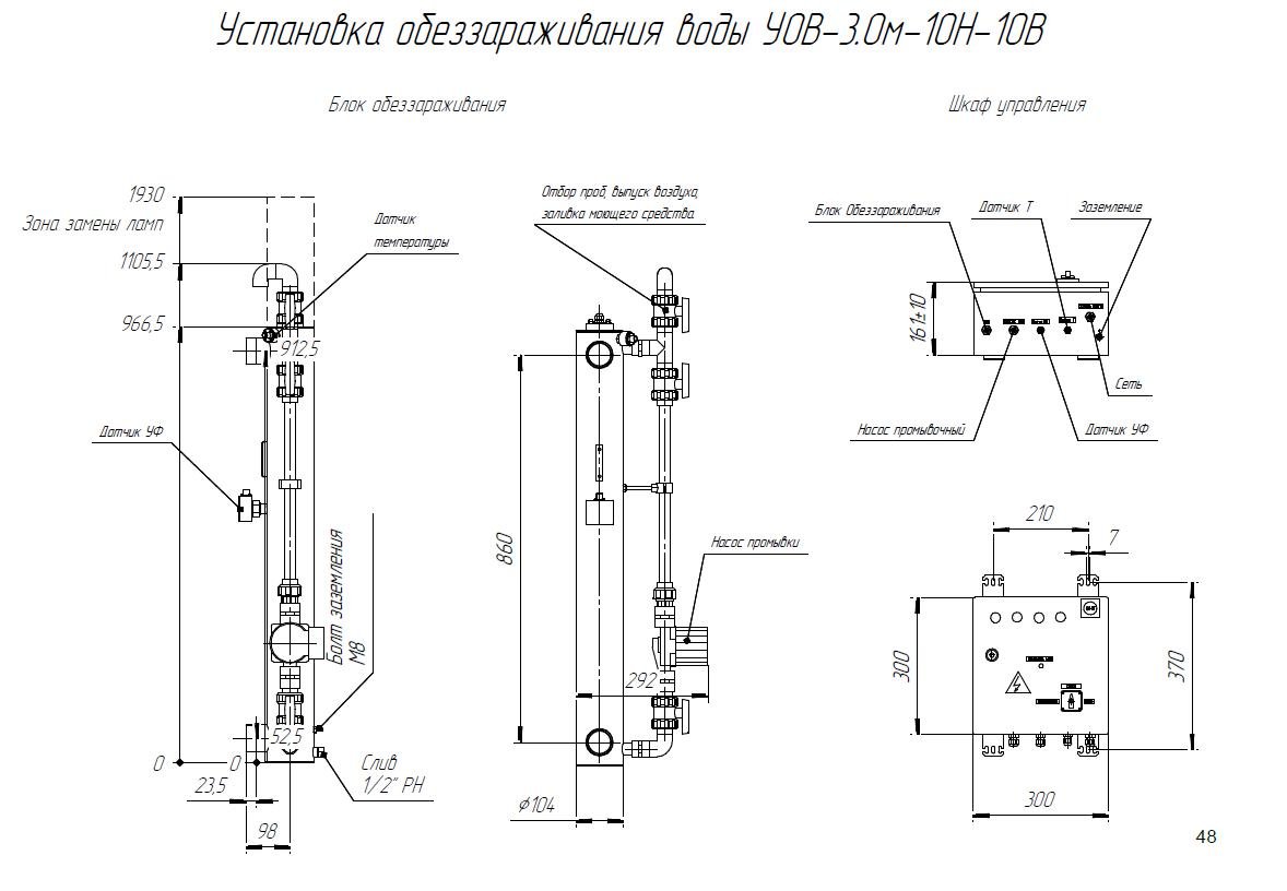 Комплект поставки: Блок обеззараживания с амальгамными УФ лампами; шкаф управления с индикаторами; датчик УФ излучения; датчик температуры; комплект ЗИП; паспорт, руководство по эксплуатации. Промывочное устройство не входит в стандартную комплектацию и заказывается отдельно