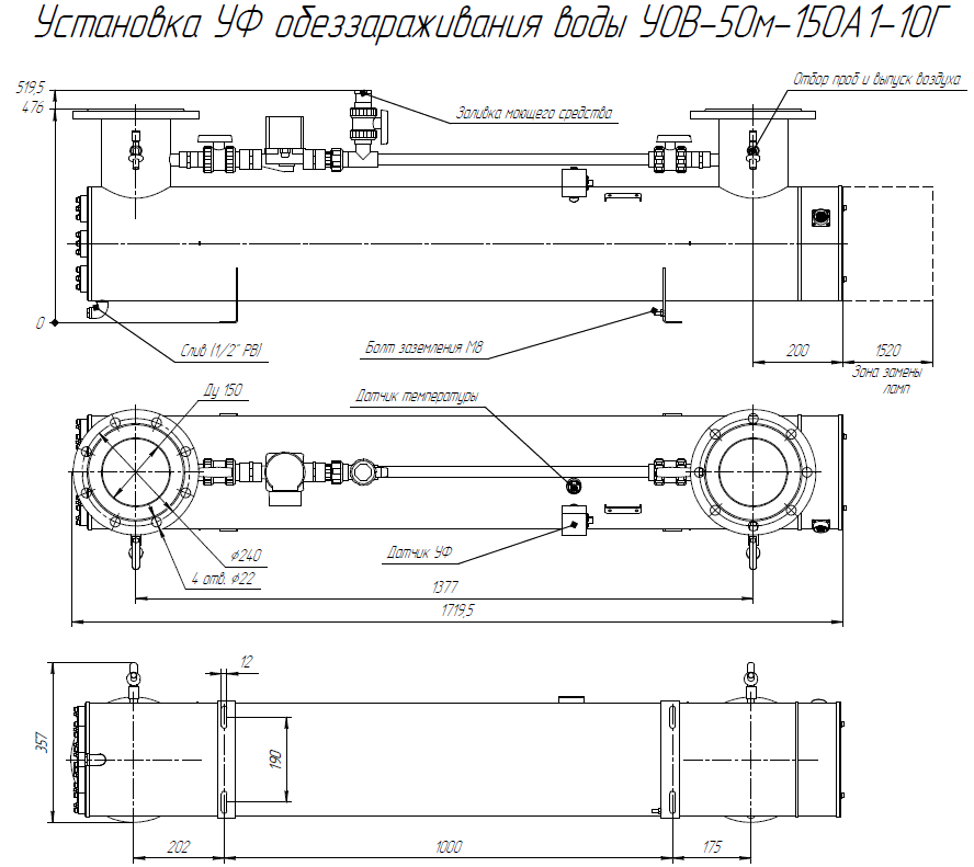 Комплект поставки: Блок обеззараживания с амальгамными УФ лампами; шкаф управления с ЖК-дисплеем; датчик УФ излучения; датчик температуры; промывочное устройство; комплект ЗИП; паспорт, руководство по эксплуатации