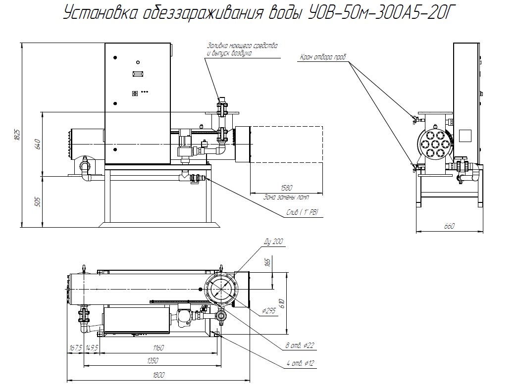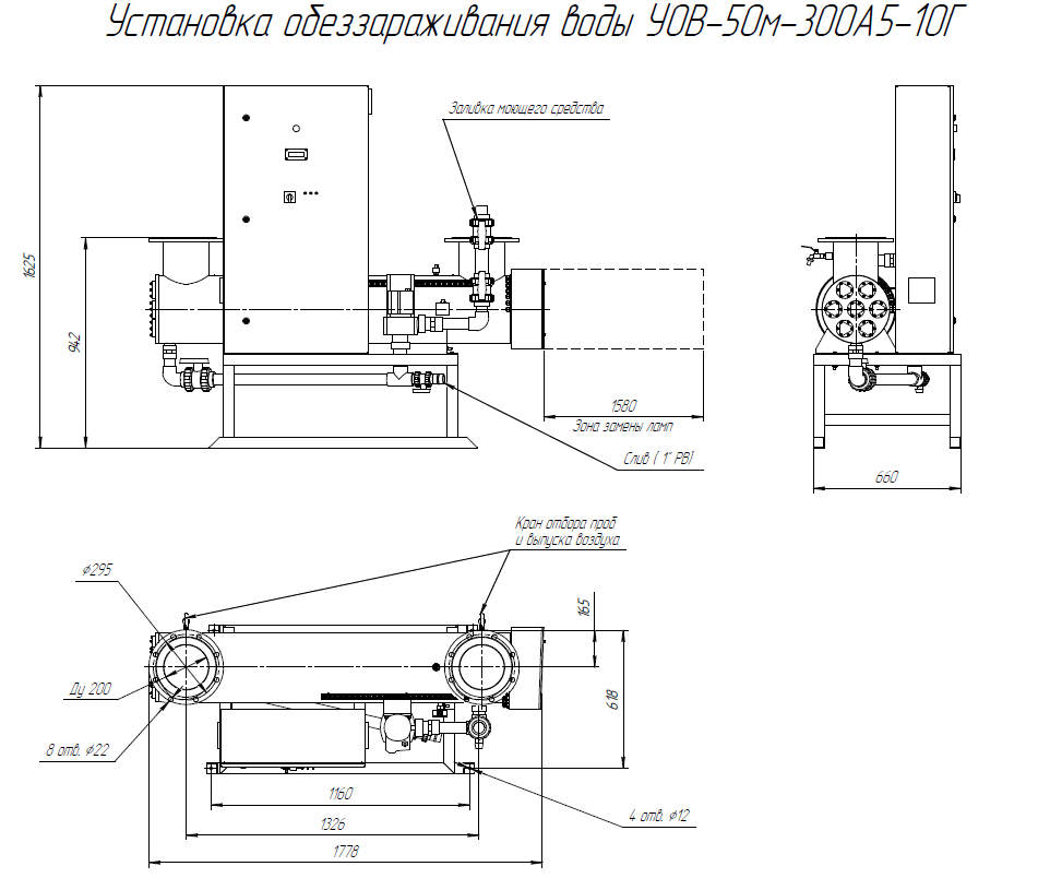 Комплект поставки: Блок обеззараживания с амальгамными УФ лампами; шкаф управления с ЖК-дисплеем; датчик УФ излучения; датчик температуры; промывочное устройство; монтажная рама; комплект ЗИП; паспорт, руководство по эксплуатации
