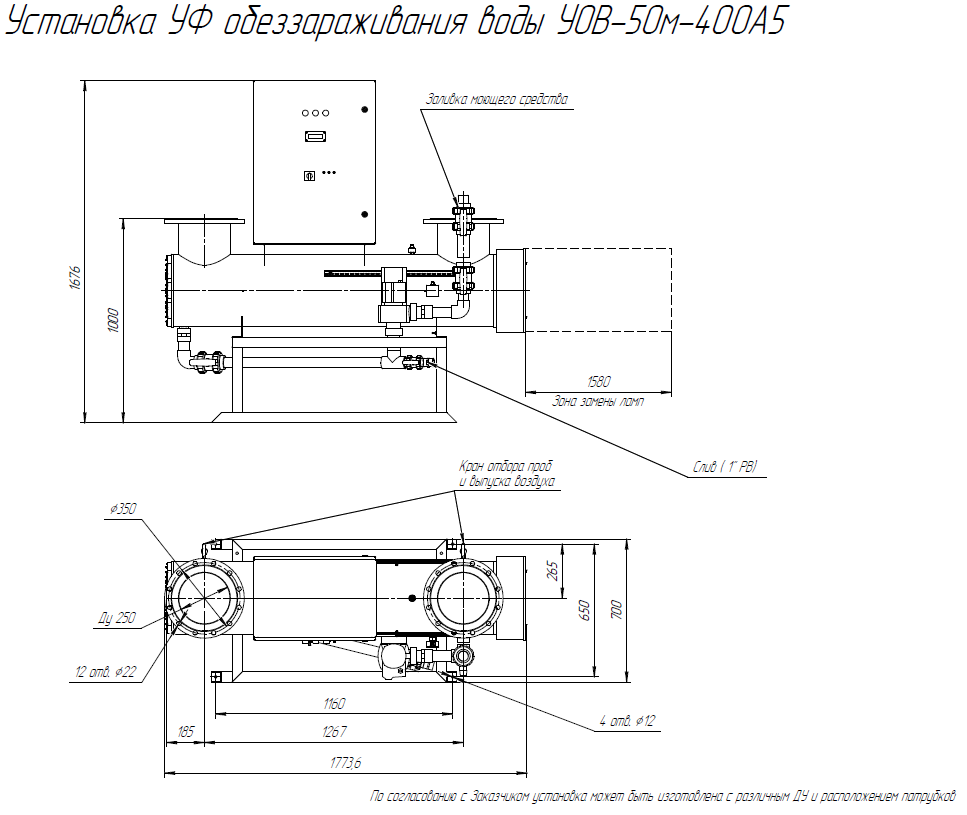Комплект поставки: Блок обеззараживания с амальгамными УФ лампами; шкаф управления с ЖК-дисплеем; датчик УФ излучения; датчик температуры; промывочное устройство; монтажная рама; комплект ЗИП; паспорт, руководство по эксплуатации