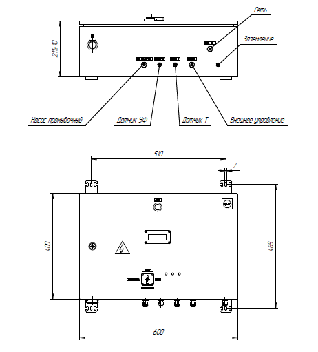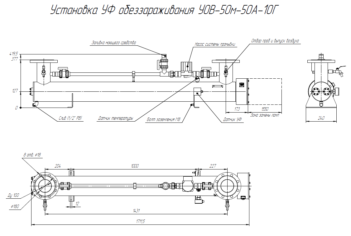 Комплект поставки: Блок обеззараживания с амальгамными УФ лампами; шкаф управления с ЖК-дисплеем; датчик УФ излучения; датчик температуры; промывочное устройство; комплект ЗИП; паспорт, руководство по эксплуатации