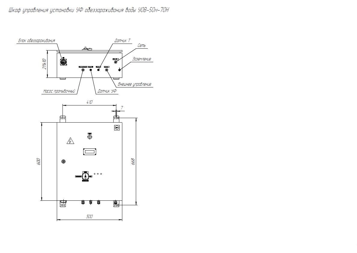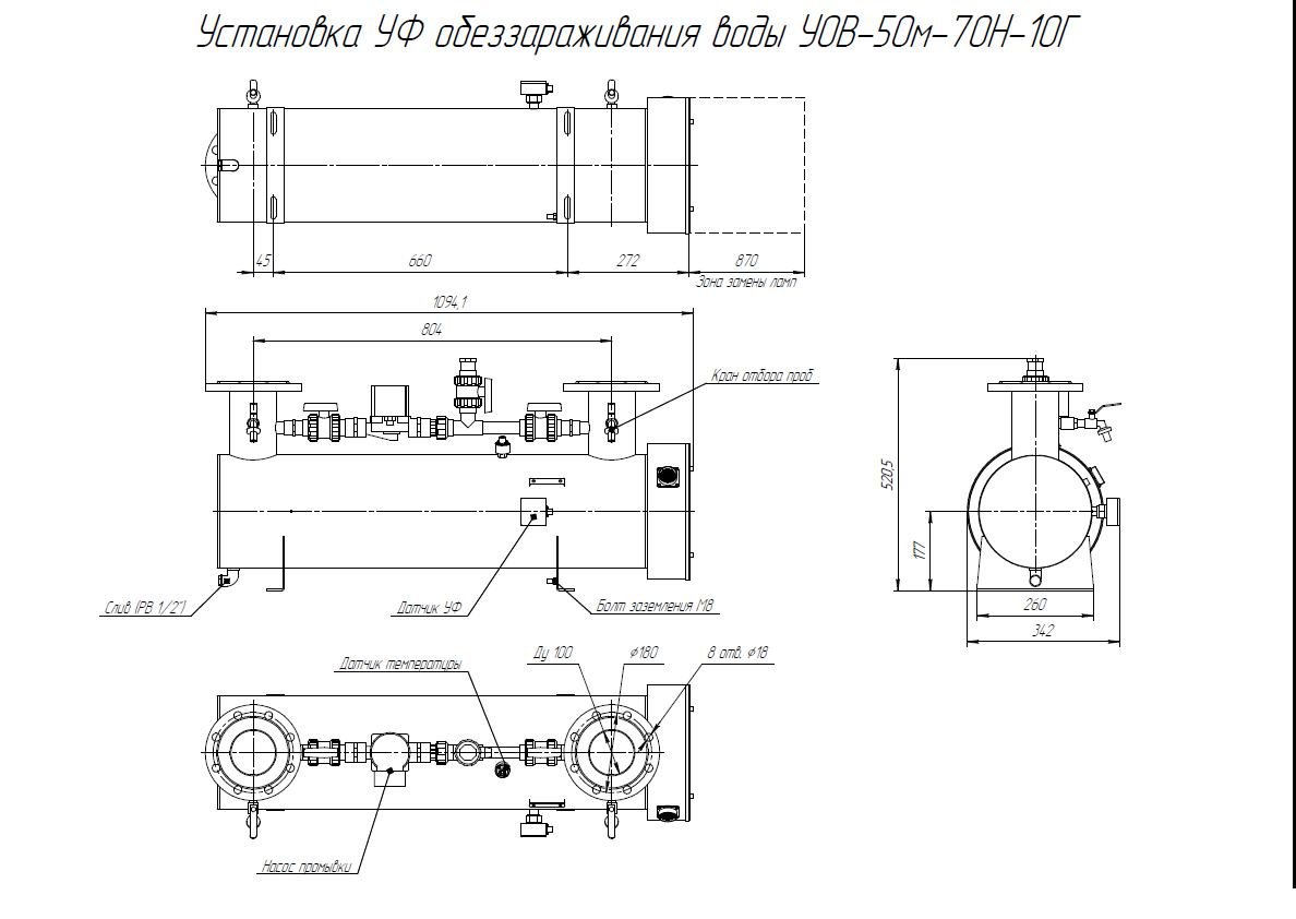 Комплект поставки: Блок обеззараживания с амальгамными УФ лампами; шкаф управления с ЖК-дисплеем; датчик УФ излучения; датчик температуры; промывочное устройство; комплект ЗИП; паспорт, руководство по эксплуатации.