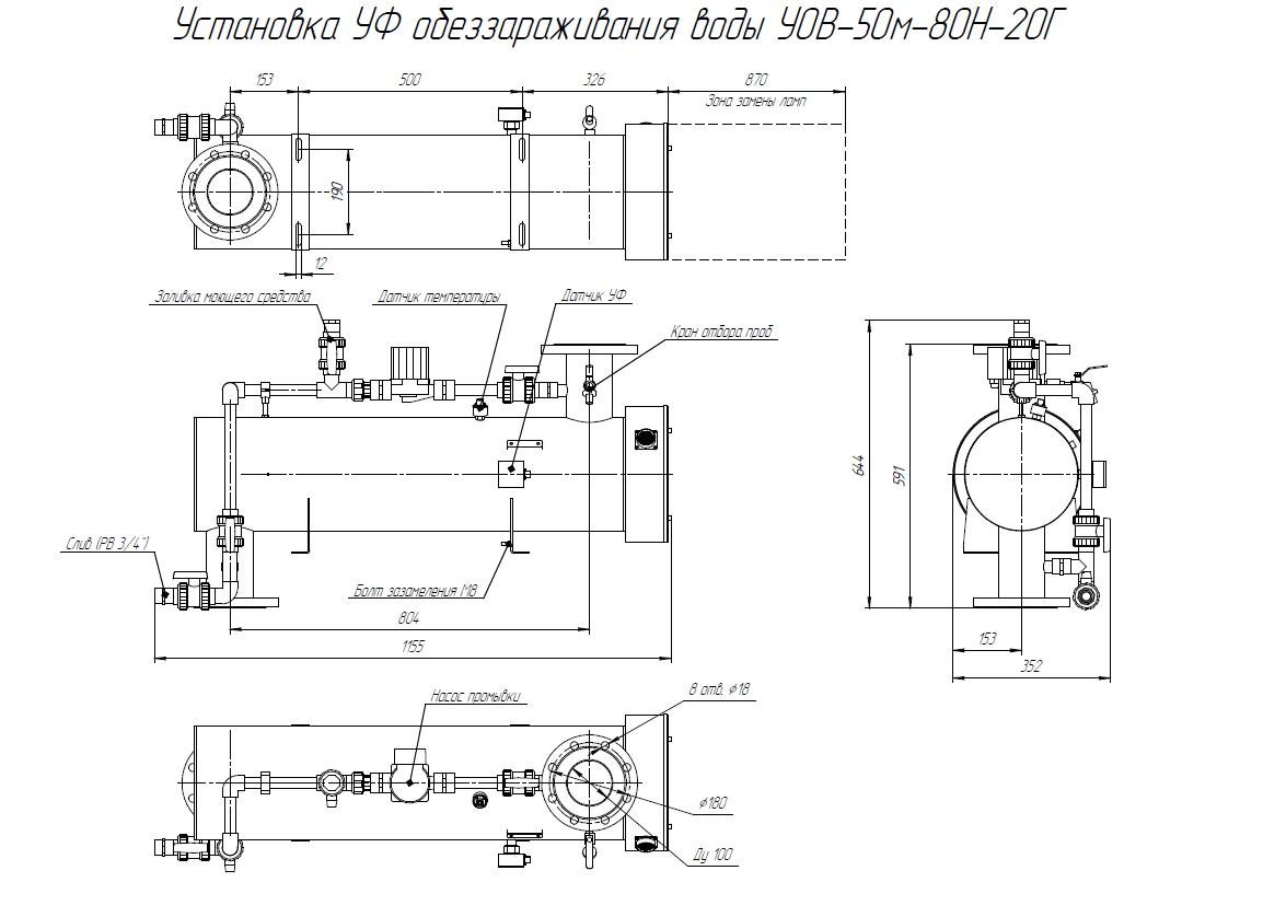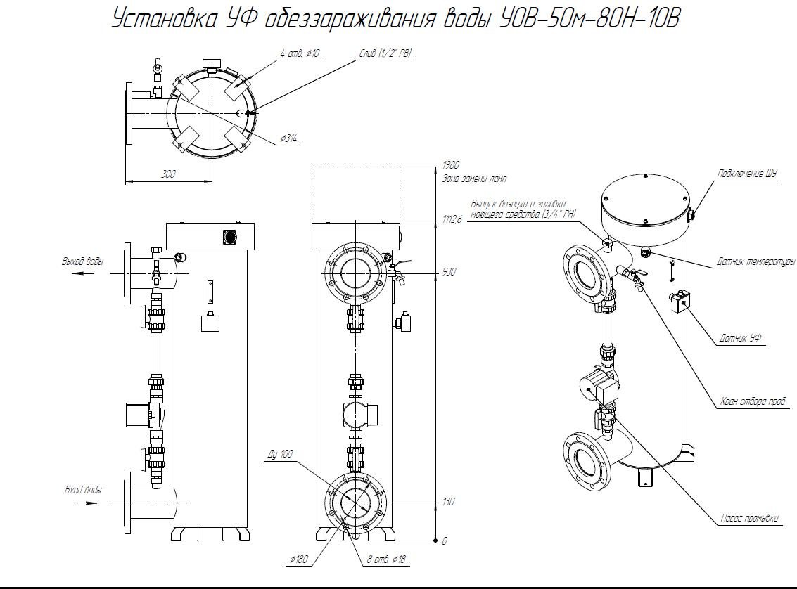 Комплект поставки: Блок обеззараживания с амальгамными УФ лампами; шкаф управления с ЖК-дисплеем; датчик УФ излучения; датчик температуры; промывочное устройство, комплект ЗИП; паспорт, руководство по эксплуатации.